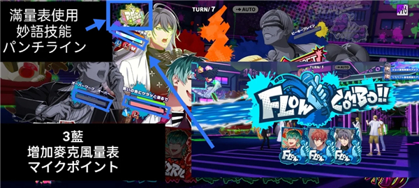 - **Flow(蓝)**:积累“麦克风量表”,满后触发“妙语技能”(パンチライン)。