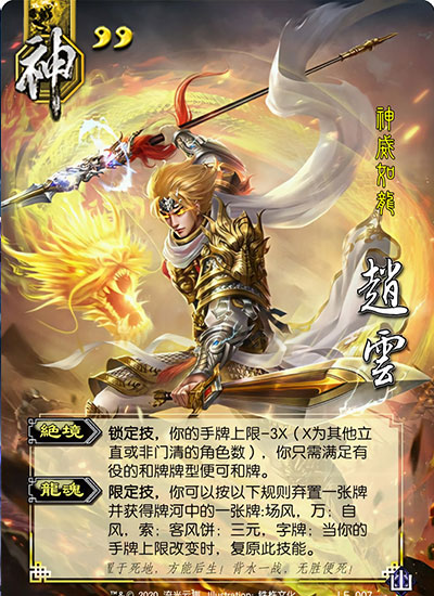 作为首个2血神将,【龙魂】技能赋予极高防御力(红桃当桃、梅花当闪等),但缺乏主动进攻手段,过牌能力弱,易成“不动白”,爆发受限。