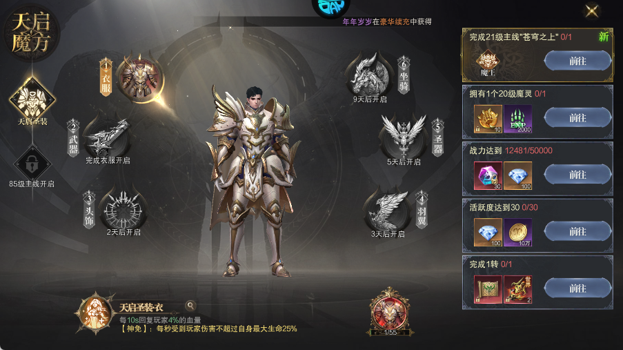 4、天启魔方开启至一定等级后,可解锁专属“天启圣衣”时装,并获得大量成长奖励,助力角色快速进阶。