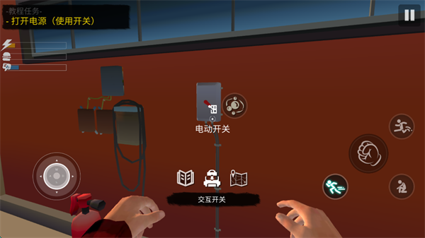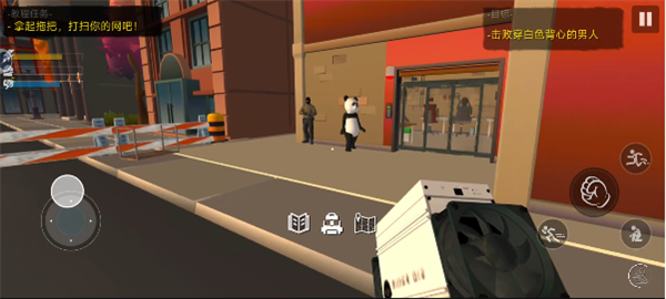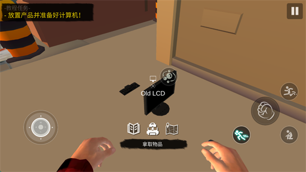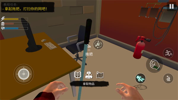 3、来到仓库后需要拿起拖把清理,将屏幕中心点对准垃圾或脚印后点击右侧拳头按钮即可。
