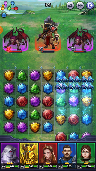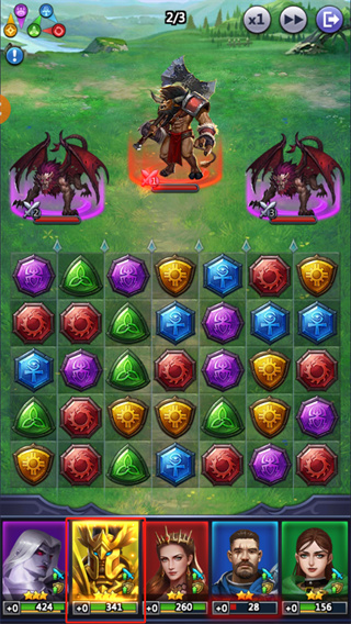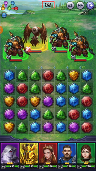 6、游戏中玩家需要点击两个相邻元素来换位置,当三个或者三个以上元素在一起,元素会消除然后变成士兵来进行攻击;