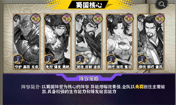 阵容介绍:以蜀国阵营为核心的阵容,异能增幅效果强,全队以关羽担任主要输出,具备较强的生存能力和爆发输出能力。