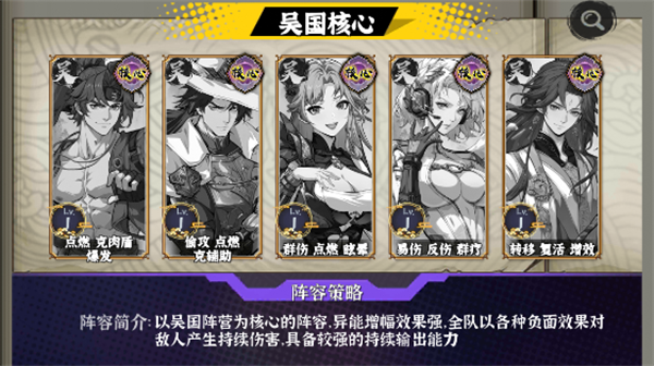 阵容介绍:以吴国阵营为核心的阵容,异能增幅效果强,全队以各种负面效果对敌人产生持续伤害,具备较强的持续输出能力