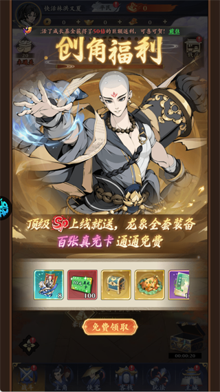 新玩家创建角色即可领取丰厚开局礼包,包含强力SP侠客“天山梦郎”、全套龙象装备以及百张真充卡,大幅降低前期养成门槛,让你迅速组建核心阵容,轻松开启江湖征途。