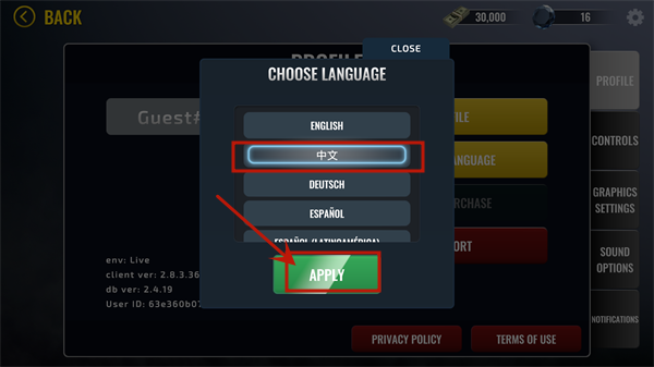 3、在弹出的语言列表中选择“中文”,然后点击“APPLY”按钮,即可成功切换为中文界面。