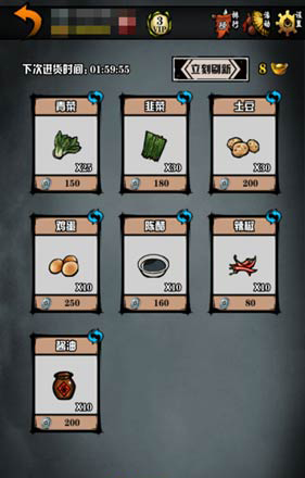 食材每4小时刷新一次购买次数。单次采购总成本为46500两,可购得: