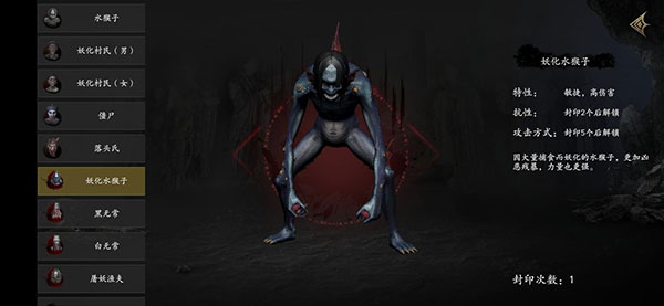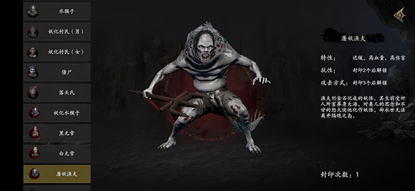 屠妖渔夫:笨重远程投掷型敌人。采用“秦王绕柱”战术绕其背后,远距离用玄冰符或雷符控制,近身后迅速刺击并闪避至其身后空档。掉落叉子与内丹。