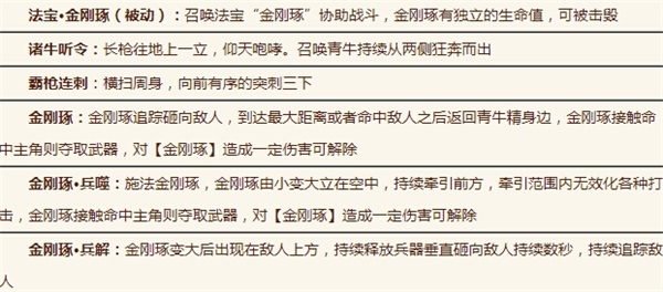 技能包括:被动【法宝·金刚琢】,以及主动技能【霸枪连刺】【金刚琢】【金刚琢·兵噬】【金刚琢·兵解】。