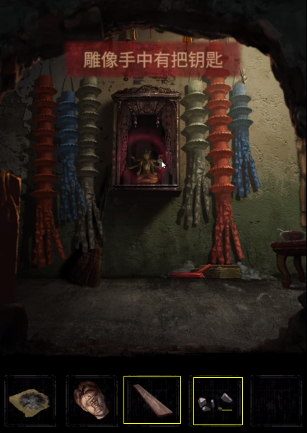 ① 在雕像处使用木板和石子,取得“钥匙”;将木偶头放置于牌位上,用画笔为其点睛,即可获得房顶饰品。