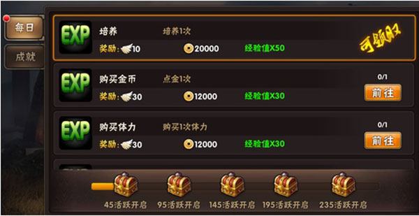 另一种是任务经验:完成每日任务不仅能获取大量经验值用于快速升级,还可积累活跃值,兑换对应的活跃宝箱奖励。