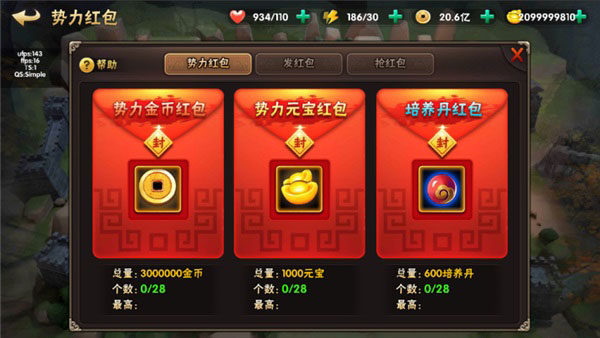 3、势力红包(联盟土豪发放红包,全体成员均可免费领取):