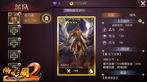 - 4星吕布进阶为“真·吕布”后,武力、智力、兵力直接翻倍,主动技能“天下无双”由提升自身150%物理攻击、30%物理防御,升级为“真·天下无双”,提升至175%物理攻击与40%物理防御。