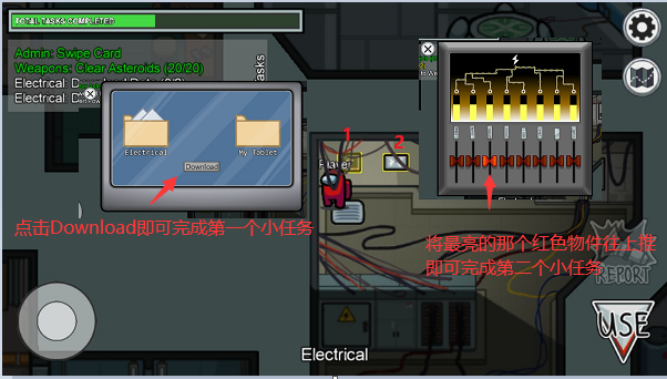 “Electrical”这个任务中有两个小任务,第一个点击“download”即可完成,第二个我们把最亮的那个红色的东西向上推就行了