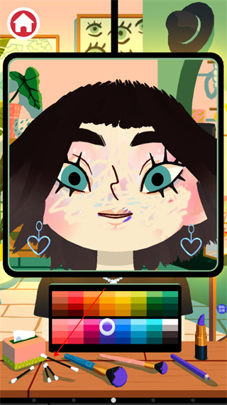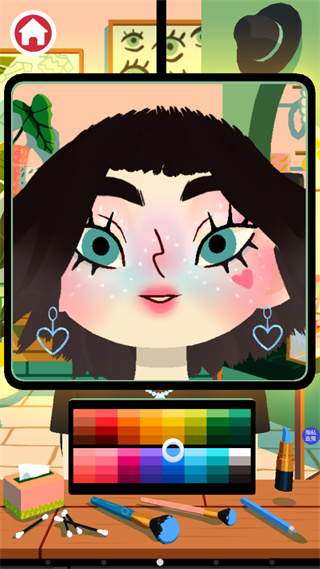 若不小心剪掉过多头发,无需担心——只需点击红色瓶子(生发剂),即可让头发重新生长。游戏整体自由度极高,支持随意尝试各种风格。角色还会做出撒娇等趣味互动,增添游戏乐趣。要进行化妆,只需点击桌面上的化妆品道具,例如眼影盘,即可开始上妆。