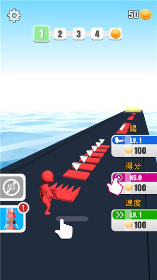 游戏以“收集—堆叠—推倒”为核心循环,每一步都充满节奏感与成就感。玩家需在奔跑中识别前方平台颜色提示,提前调整路线,确保只拾取与当前砖塔顶端相同颜色的方块。若颜色错配,砖块数量将减少,影响最终得分。成功堆叠至终点后,一记精准飞踢让砖塔平铺倒下,覆盖倍数区域即可获得对应金币收益——堆得越高,倍数越大,赚得越多!整个过程流畅爽快,兼具策略性与解压感。