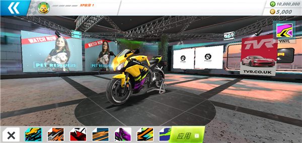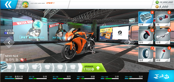 3、在车库界面可更换摩托车的关键配件,如车轮、引擎、刹车系统等,提升车辆性能。