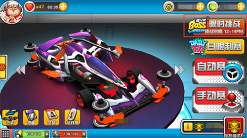 6、基础装备齐备后,开始挑战手动图,务必击败“厨师”与“机器人”Boss!厨师可恢复电量与耐久,机器人满级后可激活“虫洞车位”,显著提升成绩。此外,每位Boss对应一辆专属赛车,后期可通过掉落碎片合成,如“超极速SS”“花仙号”等。
