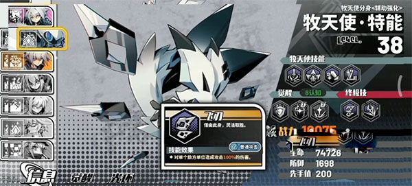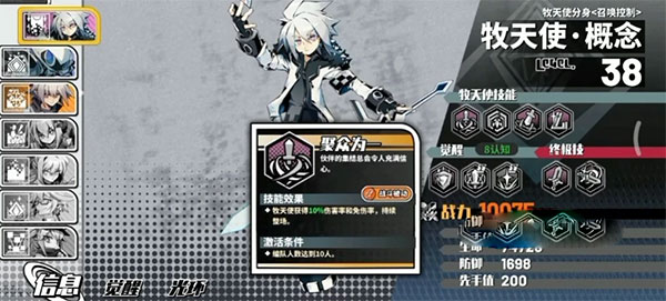 游戏中大家初始携带的是名为“概念”的牧天使,根据不同的激活条件,会有不一样的被动效果,例如有5张橙卡可以激活强者特权,让牧天使和角色都获得15%的攻击率、防御率、最大生命值提升。除了这些基础被动技能外,还有觉醒技能,这个一般是区别开不同天使定位的关键,例如概念是提供增伤、能量、分身。终结技则是单体和群体伤害,属于中规中矩的输出型天使。