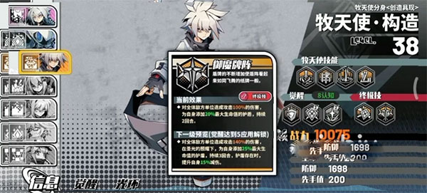 随着剧情推进以及信物的收集,玩家会解锁“特能”,该天使拥有个体强化加降费的技能,觉醒后还可以增加进场能量以及对敌方首领的伤害,终结技高额单体伤害以及对首领特攻。毫无疑问这是一个专门用来挑战强力boss时需要用到的天使。