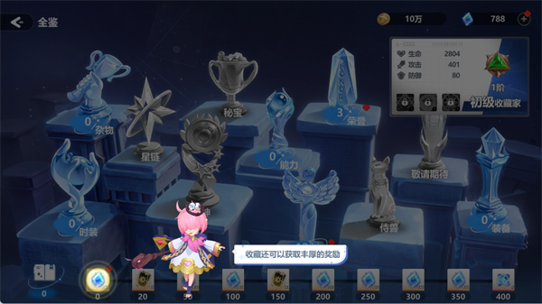 在游戏中收集杂物、时装、装备等藏品,每解锁一定数量的藏品,就能获得钻石和高级契约。这个系统是长期稳定的资源渠道,让你在不知不觉中积累大量物资。