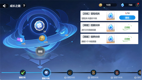 通过完成冒险闯关、英雄招募与培养等目标,你可以解锁丰富的奖励。每当达成一个新的成长阶段,就能领取钻石作为奖励,是稳定的钻石来源。
