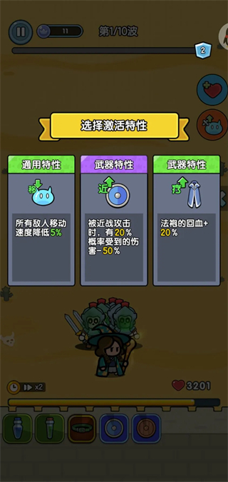 SS:投资类特性(50%经验,每波多10银币,100银币等),这些特性要在前10波选择,后期别选