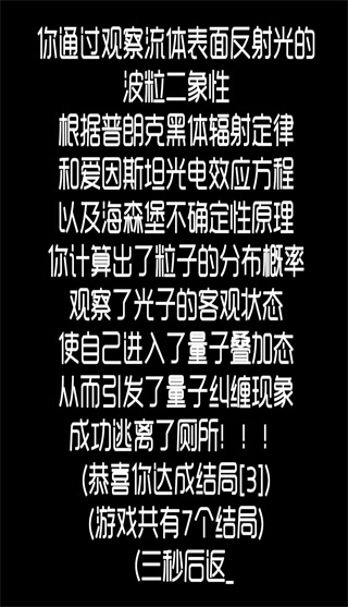 4、包含十余种不同结局,从搞笑到哲思,从隐藏彩蛋到终极真相,全由你的决策决定。