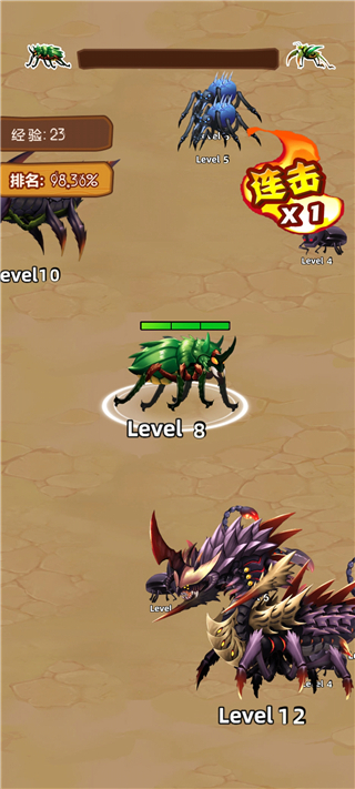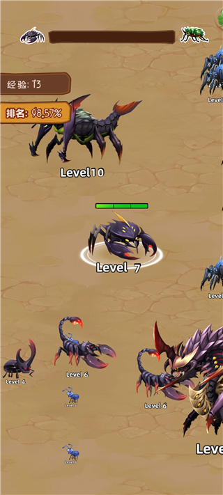 昆虫超进化是一款融合策略、养成与休闲元素的趣味手游。玩家将操控一只初始形态为蚂蚁的昆虫,在限定地图中展开生存挑战:吞噬体型更小的生物以获取能量,同时巧妙躲避比自己强大的敌人,玩法机制与经典“大鱼吃小鱼”模式相似。随着不断吞噬,你的昆虫将逐步进化,解锁蝎子、蜘蛛、甲壳虫、螳螂等多种形态,每种昆虫都拥有独特的属性与战斗风格。进阶过程中,你需要合理规划成长路径,精准判断何时进攻、何时回避,通过策略性操作积累经验,最终成长为食物链顶端的终极掠食者。