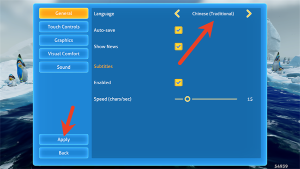 2、选择上方Language(语言)通过点击左右切换,选中Chinese(Traditional),接着点击左下角Apply(应用设置)。