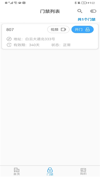 点击【门禁】进入设备总览页,所有已授权门禁按编号、地理位置、有效期、当前状态结构化呈现;支持视频预览门口实况,并直接触发“一键开门”指令。