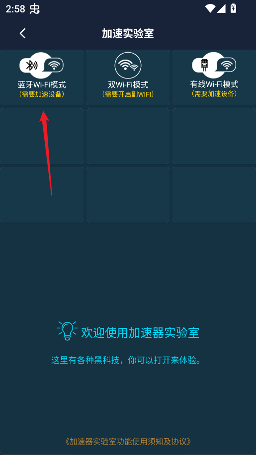 3、任选【蓝牙WiFi模式】【双WiFi模式】【有线+WiFi模式】,以蓝牙模式为例——点击底部【蓝牙】按钮完成设备快速配对;