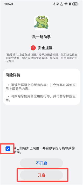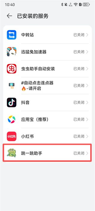 2、启用无障碍服务:返回设置→【辅助功能】→【无障碍】→【已安装的服务】→找到【跳一跳助手】→点击进入→勾选【已知晓风险】→开启服务;