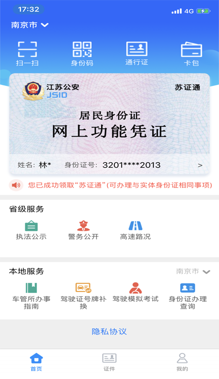 3、成功领取苏证通后,首页会显示居民身份证网上功能凭证,还可使用扫一扫、身份证等功能,以及省级/本地政务服务(如车管所办事、身份证办理查询)。