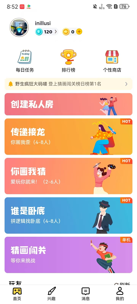 1、打开画画接龙,在首页打开想玩的游戏种类,如传递接龙/你画我猜/谁是卧底/猜画闯关;