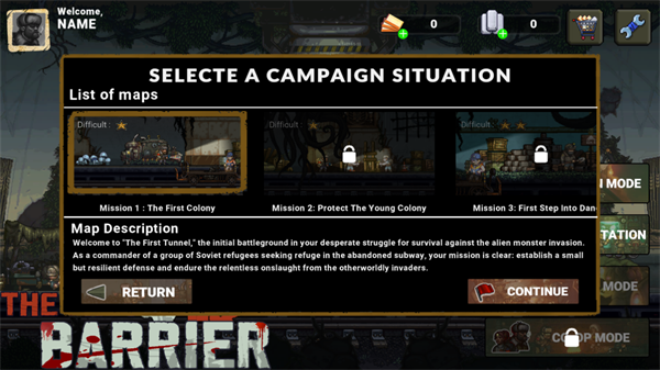 2. 选择当前可进入关卡 → 点击【CONTINUE】载入场景;