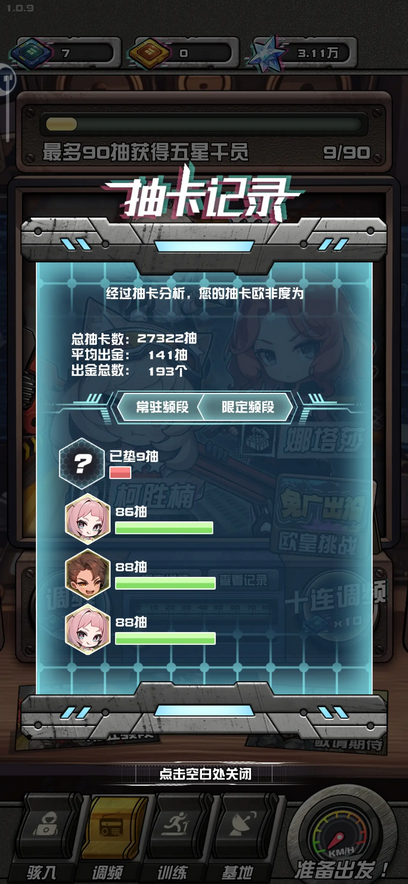 新手进游戏第一步先随便抽抽卡获取一下角色。角色分UR(彩色)SP(金色)SSR(紫色)。后续看看广告都会全角色满命的不用急。