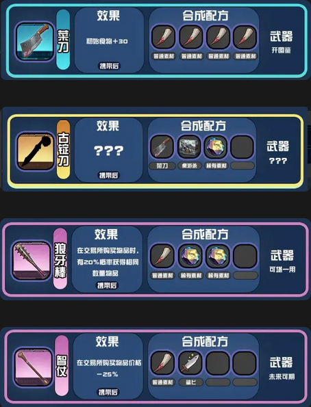 等玩了几局有一定的资源了就可以在研究所合成狼牙棒智仗古锭刀(通过菜刀加其他材料合成)