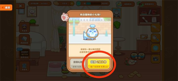 旅馆界面里,猫猫每天都会随机出现很多互动标志,点击后可以通过玩小游戏获得奖励,个人感觉礼物标志性价比最高(看广告可以获得10张车票),建议大家有时间的话可以多等几次刷新领礼物。