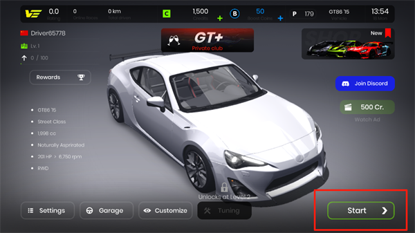 1、启动游戏 → 选择心仪赛车 → 点击【Start】进入车库准备