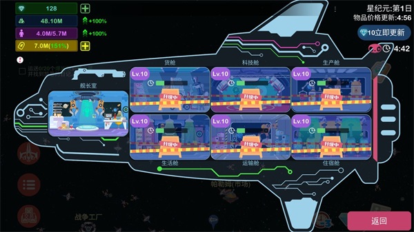 ✅ 舱室升级有侧重:生产舱(解锁暴利商品)、科技舱(推进任务+材料获取)为黄金组合;生活/住宿舱影响角色等级上限,建议同步跟上避免卡关