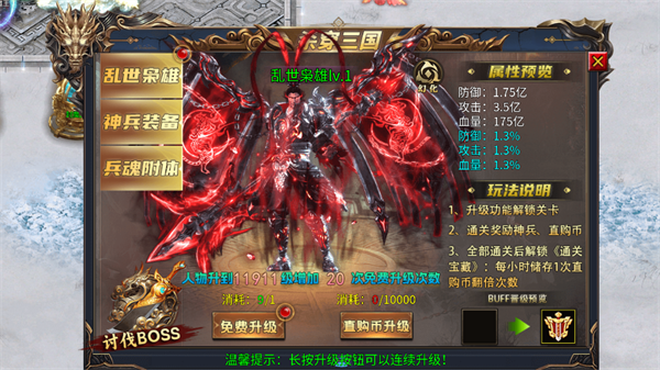 挑战三国BOSS链式副本,全关卡通关后永久解锁《通关宝藏》,每小时自动储存1次“直购币翻倍”机会,资源滚雪球式增长!