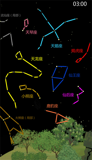 ③ 03:00 可收集:天琴座、天鹅座、蝎虎座、天龙座、小熊座、仙王座、仙后座、鹿豹座