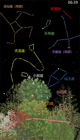 春季(3月25日 06:39)可收集:狐狸座、天琴座、天龙座、小熊座、仙王座、仙后座、鹿豹座。