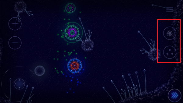 ③ 放大控局,缩小观势:左下“+”放大聚焦单细胞战斗细节,右下“-”拉远俯瞰全局领地争夺态势。