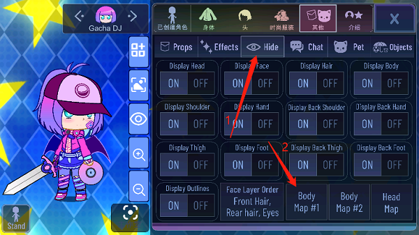 2、游戏中进入【道具】→点击右上角【Hide】隐藏UI,再点击底部【Body Map#1】调出角色分层模板;