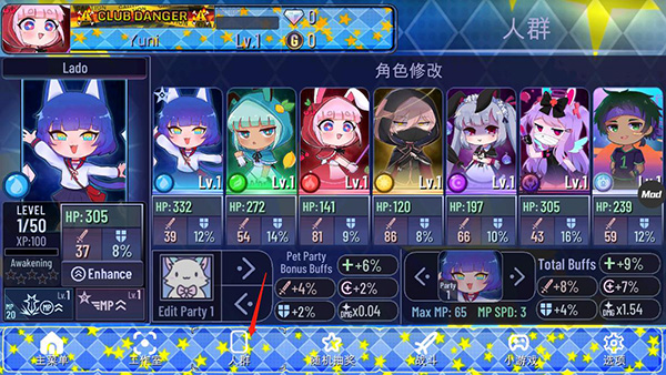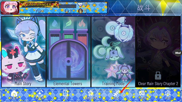 2、底部导航栏涵盖【主菜单】【工作室】【人群】【抽卡】【战斗】【小游戏】六大模块,功能一目了然;