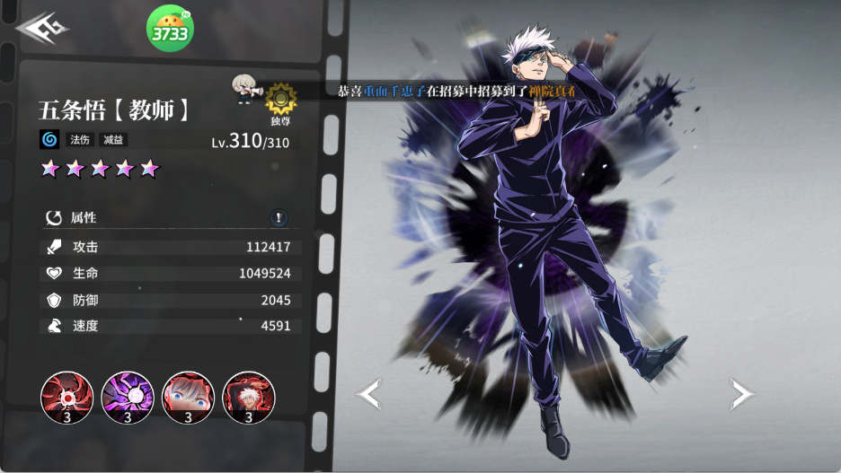五条悟(核心输出/控场)+ 虎杖悠仁(爆发收割)+ 东堂葵(破盾压制)+ 七海建人(群体减益)+ 禅院真希(速攻补刀)——攻守兼备,副本通关率超95%。