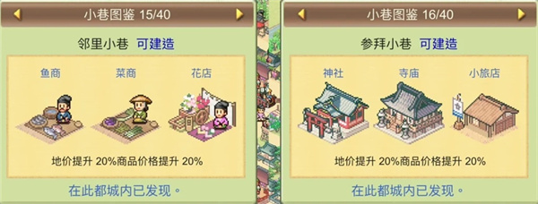 「小巷图鉴」是本作最具策略深度的系统——当特定建筑相邻组合(如酒馆+双陆屋+澡堂),即可激活「欢乐小巷」认证,同步提升地价与商品价格。全图鉴涵盖20类特色街区,从烟火气十足的「朝饷小巷」(饭馆+菜商+鱼商)到雅致清幽的「赏花小巷」(茶馆+馒头店+樱花),从商业爆棚的「富豪町」(贵族宅邸+和服店+香木屋)到武风凛然的「带刀町」(铁匠铺+小弓屋+瞭望台),每一种组合都带来差异化收益与视觉氛围。图鉴内容全程可视化解锁,助你提前规划发展路线,让每寸土地都物尽其用。