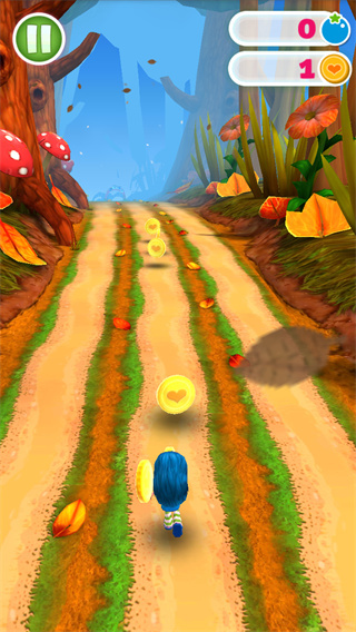 2. 控制角色在森林、花园、云朵小径间疾驰:灵活左右闪避树桩、石块,及时上下跳跃或下滑穿越高低障碍,同时抓取沿途金币与闪亮水果;