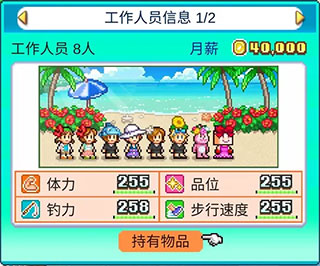员工拥有四大属性:体力、品位、钓力、步行速度(钓力上限258,其余均为255)。属性可通过完成顾客目标获得的卷轴、商会购买的强化饮料、钓鱼实践、日常工作随机成长及装备员工道具持续提升。